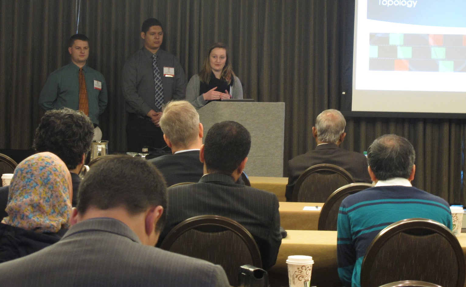 Sterling Holcomb, Audrey Knowlton, and Juan Guerra published results of their research project in WinnComm'16, the Wireless Innovation Forum Conference on Wireless Communications Technologies and Software Defined Radio, in Reston, VA. Their paper, titled "Power Efficient Vehicular Ad Hoc Networks" was a new approach for Vehicular AdHoc Networks (VANETS) that represents a significant reduction in power use. This benefit enables more vehicles to communicate simultaneously. Through simulation, students showed that their approach to VANETs maintains its update frequency despite bumper to bumper traffic and uses two to five orders of magnitude less power than an IEEE 802.11 network with clustering and 1 mW transmit power. Overall, the network performed well and is a viable improvement to the standard.